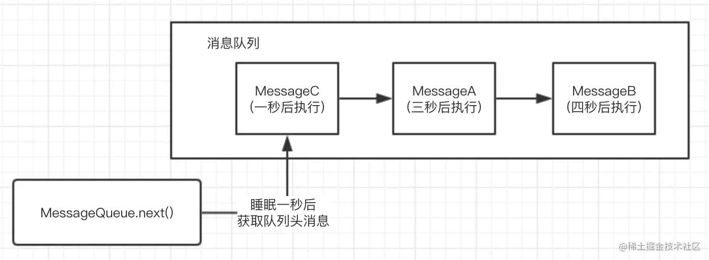 MessageQueue 是一种先进先出的数据结构,底层实现是按时排序的单向链表,当有 Message 入队时,按照 Message 的 when 值排序插入,然后出队时则去表头的 Message;