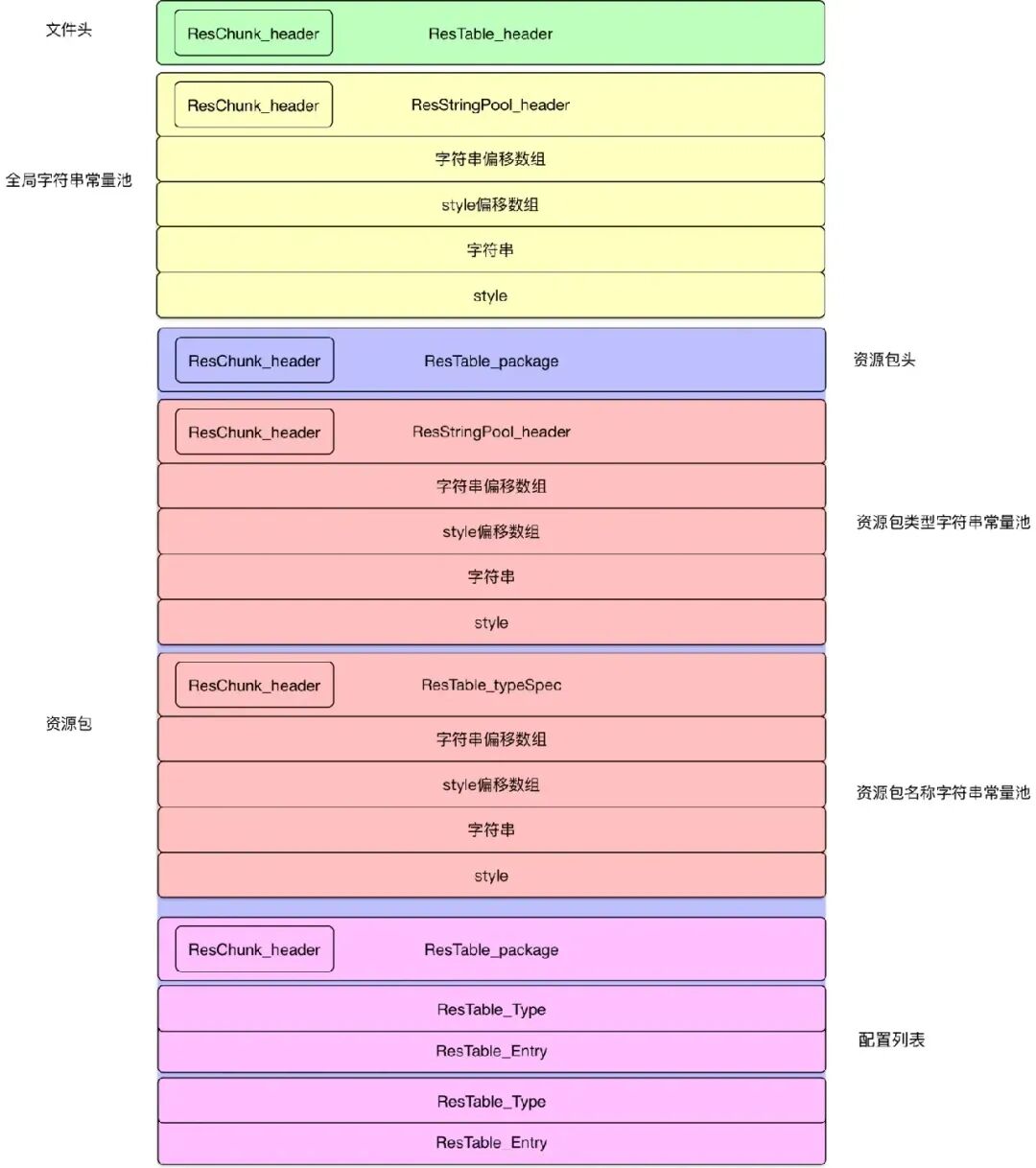 - 资源类型字符串池:存放资源的类型。