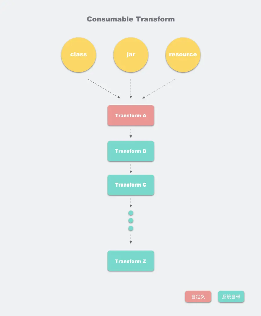 每个Transform其实都是一个gradle task,Android编译器中的TaskManager将每个Transform串连起来,第一个Transform接收来自javac编译的结果,以及已经拉取到在本地的第三方依赖(jar. aar),还有resource资源,注意,这里的resource并非android项目中的res资源,而是asset目录下的资源。这些编译的中间产物,在Transform组成的链条上流动,每个Transform节点可以对class进行处理再传递给下一个Transform。我们常见的混淆,Desugar等逻辑,它们的实现如今都是封装在一个个Transform中,而我们自定义的Transform,会插入到这个Transform链条的最前面。