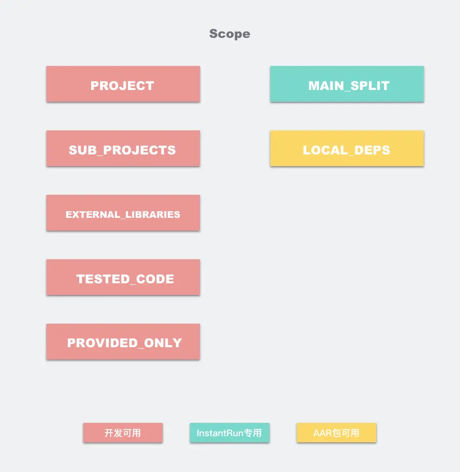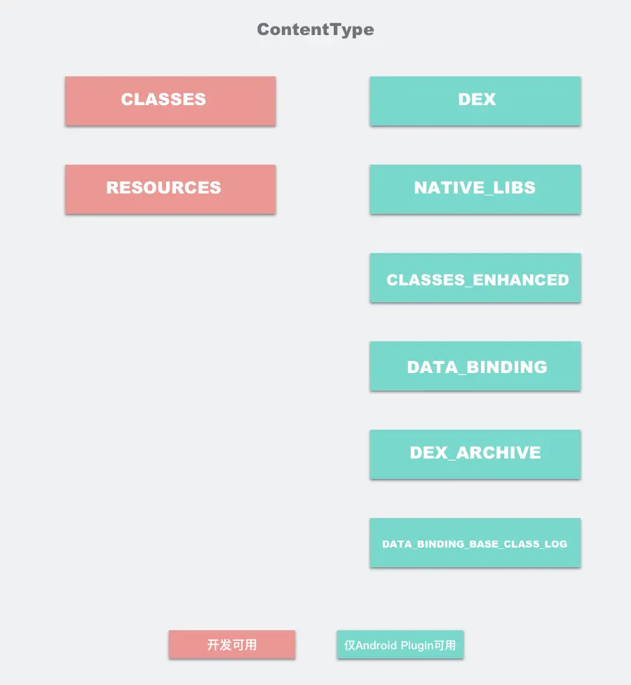 从图中可以看到,除了CLASSES和RESOURCES,还有一些我们开发过程无法使用的类型,比如DEX文件,这些隐藏类型在一个独立的枚举类ExtendedContentType中,这些类型只能给Android编译器使用。另外,我们一般使用 TransformManager中提供的几个常用的ContentType集合和Scope集合,如果是要处理所有class和jar的字节码,ContentType我们一般使用TransformManager.CONTENT_CLASS。