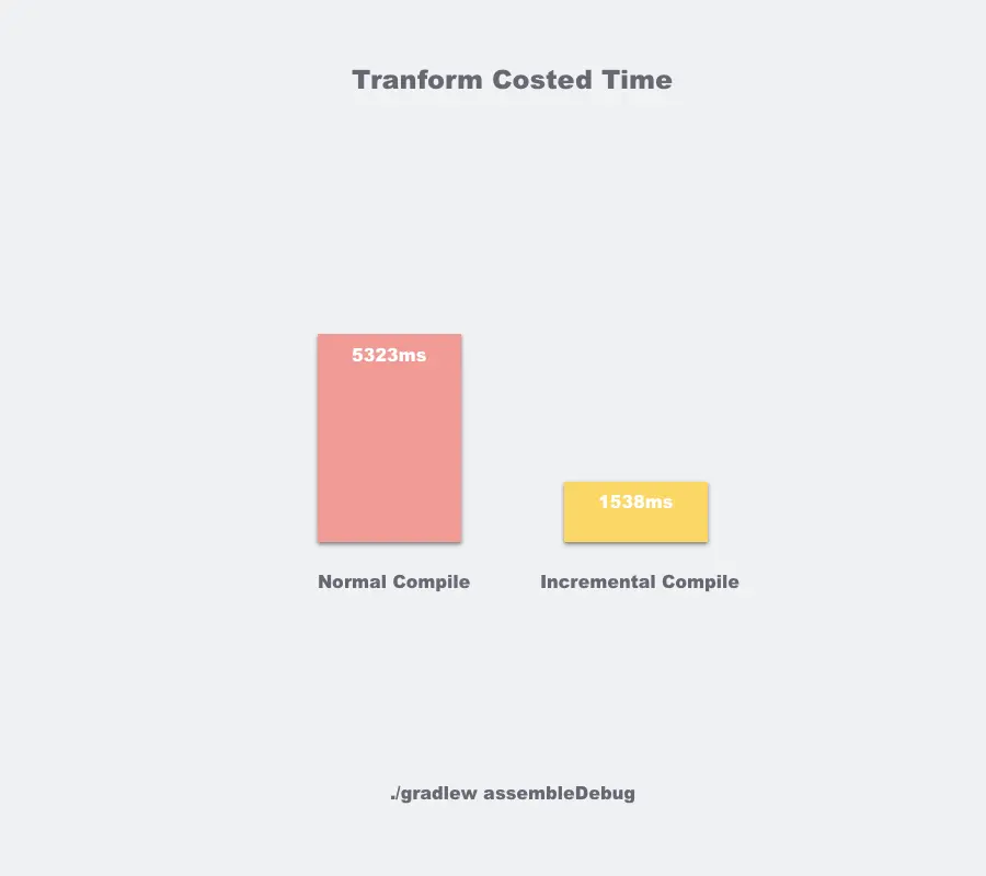 然后,让我们再做另一个试验,我们在项目中模拟日常修改某个class文件的一行代码,这时是符合增量编译的环境的。然后在刚才基础上还是做同样的插桩逻辑,对比增量Transform和全量Transform的差异。