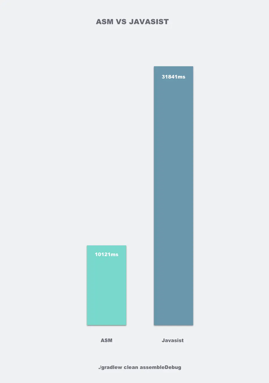 我们可以来做一个对比,上面我们所做的计算编译时间实验的基础上,做如下试验,分别用ASM和Javasist全量处理工程所有class,并且都不开启并发处理的情况下,一次clean build中,transform的耗时对比如下