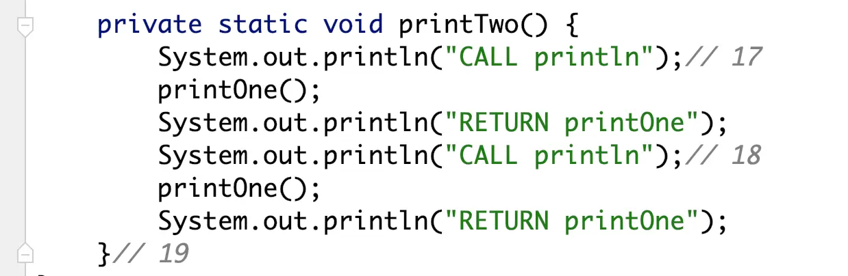 private static void printTwo() { System.out.println("CALL printOne"); printOne(); System.out.println("RETURN printOne"); System.out.println("CALL printOne"); printOne(); System.out.println("RETURN printOne");}idea下可以开启一个选项,让查看class内容时,保留真正的行数