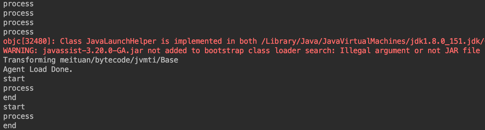 以下为运行时重新载入类的效果:先运行Base中的main()方法,启动一个JVM,可以在控制台看到每隔五秒输出一次”process”。接着执行Attacher中的main()方法,并将上一个JVM的pid传入。此时回到上一个main()方法的控制台,可以看到现在每隔五秒输出”process”前后会分别输出”start”和”end”,也就是说完成了运行时的字节码增强,并重新载入了这个类。