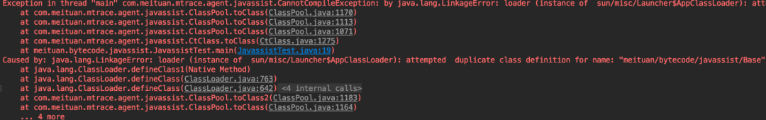 如果我们在一个JVM中,先加载了一个类,然后又对其进行字节码增强并重新加载会发生什么呢?模拟这种情况,只需要我们在上文中Javassist的Demo中main()方法的第一行添加Base b=new Base(),即在增强前就先让JVM加载Base类,然后在执行到c.toClass()方法时会抛出错误,如下图20所示。跟进c.toClass()方法中,我们会发现它是在最后调用了ClassLoader的native方法defineClass()时报错。也就是说,JVM是不允许在运行时动态重载一个类的。