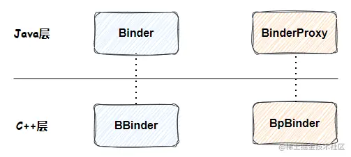 而 Binder、BinderProxy 则是它们的 Java 层表示。如下图: