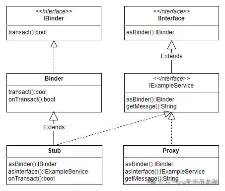 try { String message = mExampleService.getMessage();} catch (RemoteException e) { e.printStackTrace();}在 AIDL 自动生成的 IExampleService.java里,最关键的是 Stub 和 Proxy。它们之间的关系如下图: