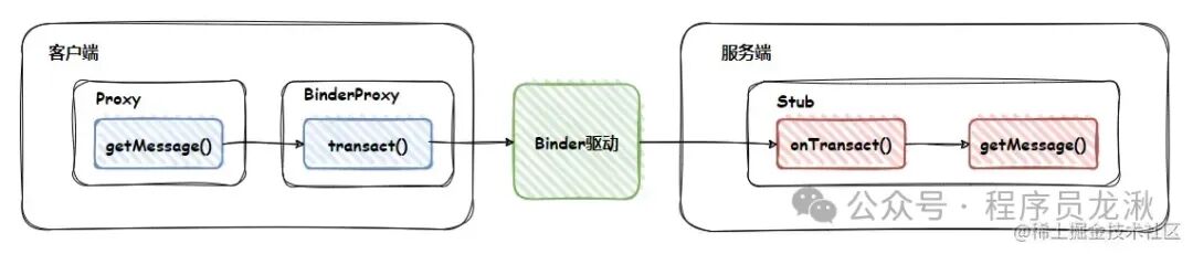 public String getMessage() throws android.os.RemoteException { // _data 是写缓冲区 android.os.Parcel _data = android.os.Parcel.obtain(); // _reply 是读缓冲区 android.os.Parcel _reply = android.os.Parcel.obtain(); String _result; try { _data.writeInterfaceToken(DESCRIPTOR); // TRANSACTION_getMessage 是函数索引 // mRemote 是 BinderProxy 的实例 boolean _status = mRemote.transact(Stub.TRANSACTION_getMessage, _data, _reply, 0); if (!_status && getDefaultImpl() != null) { return getDefaultImpl().getMessage(); } _reply.readException(); // 从读缓冲区读取远程调用的结果 _result = _reply.readString(); } finally { _reply.recycle(); _data.recycle(); } return _result;}Stub 通常用于服务端。Stub 继承自 Binder,代表它就是一个 Binder 实体。它是一个抽象类,不会实现 getMessage(),交给子类去实现。我们需要留意一下它的 onTransact():