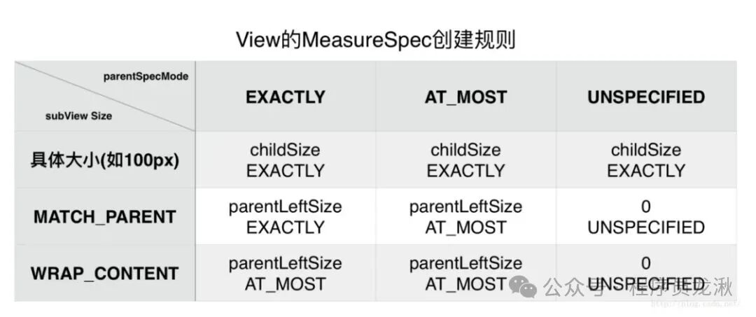 这个没啥好说的,理解+记忆这个表格,子View的MeasureSpec由父View根据自身的MeasureSpec和子View的LayoutParams来共同确定子View的MeasureSpec,注意,即使确定了子View的MeasureSpec并不一定决定了子View的大小,自定义View可以根据需要修改这个值,最终通过setMeasuredDimension(width,height)设置最终大小。