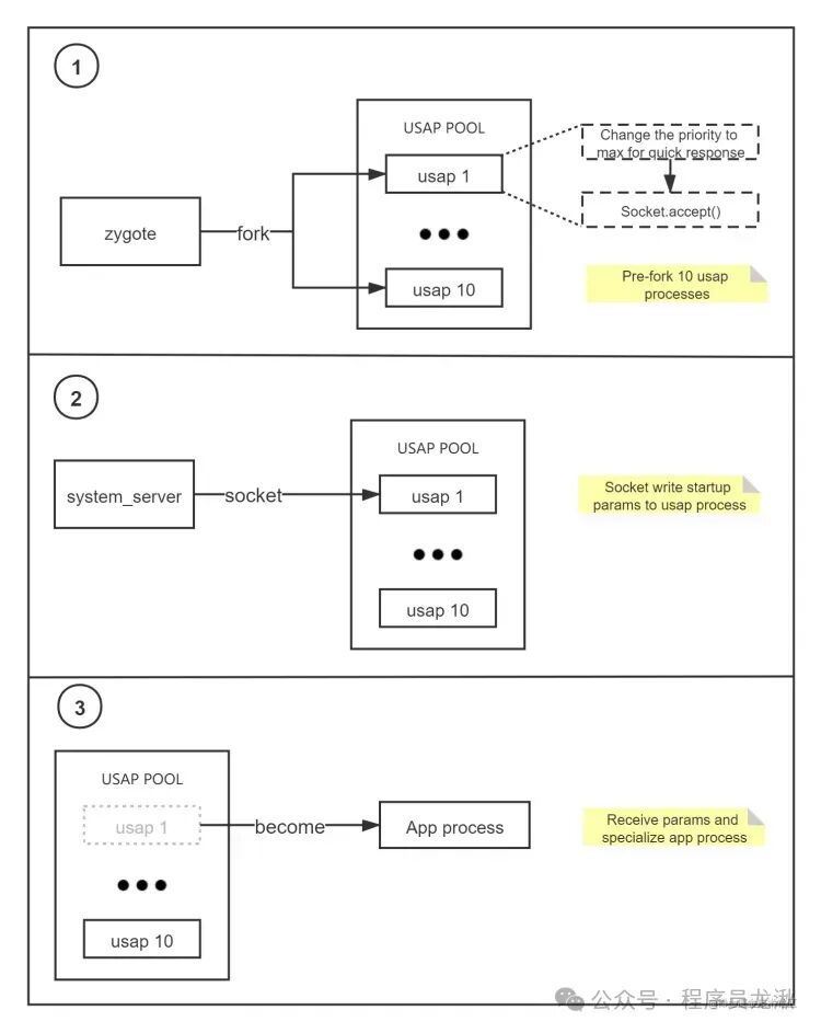 当开启USAP的功能后,zygote会维护一个进程池,其中最多可容纳10个USAP进程。以下是根据图示罗列的详细工作流程。