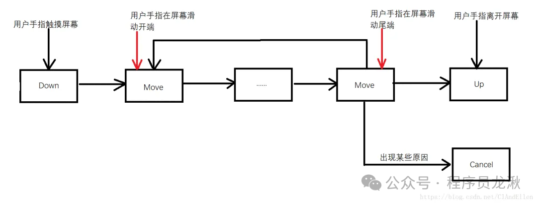 - 同一次触摸事件序列是从手指接触屏幕的那一刻起,到手指离开屏幕的那一刻结束,在这个过程中所产生的一系列事件,这个事件的序列以down开始,中间含有数量不定的move事件,最终以up事件结束。