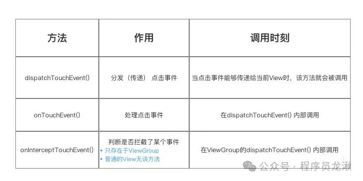 事件分发机制使用的是责任链设计模式,从Activity如果传到最下层的View都没有组件处理该事件,该事件会依次回传到Activity。这里面就涉及到3个重要的方法: