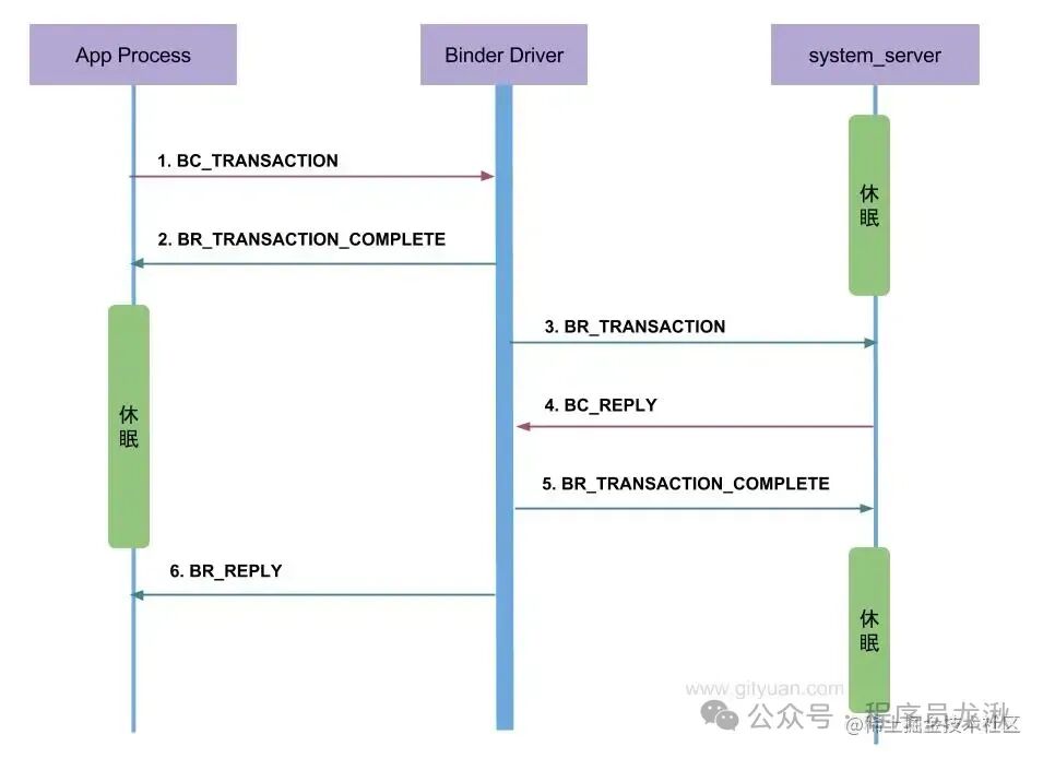 driver层处理完返回,IPCThreadState::talkWithDriver处理完此次通讯也返回,回到IPCThreadState::waitForResponse,读取处理mIn(bwr read_buffer)中driver写入的BR_TRANSACTION_COMPLETE对应数据。 处理完BR_TRANSACTION_COMPLETE后,由于需要等待接收端的reply,所以继续循环调用到talkWithDriver,然后到driver binder_thread_read中休眠,等待reply