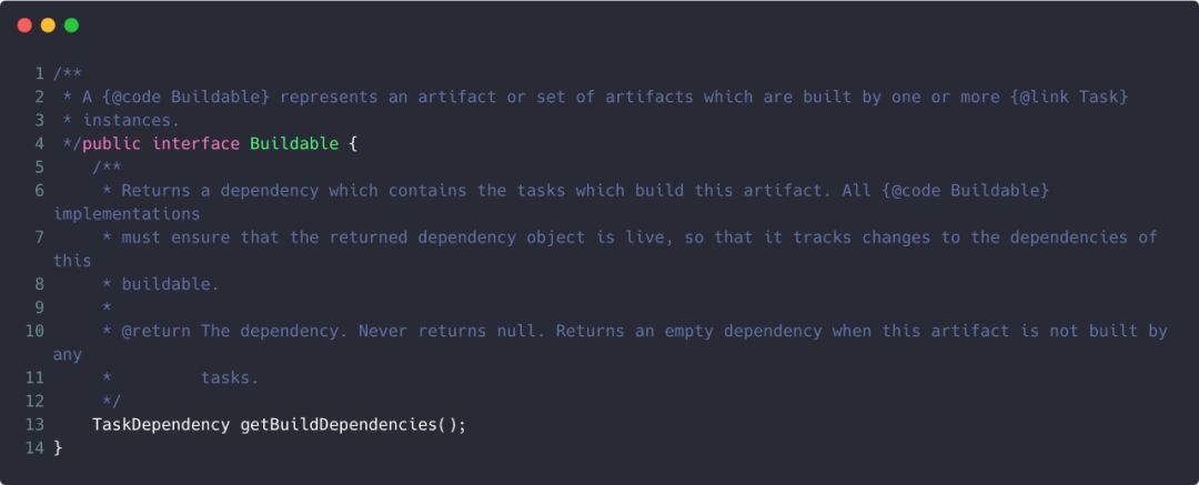 注意FileCollection继承的接口,分别有Iterable,AntBuilderAware和Buildable,特别注意Buildable这个接口,它里面含有任务依赖信息,其定义如下: