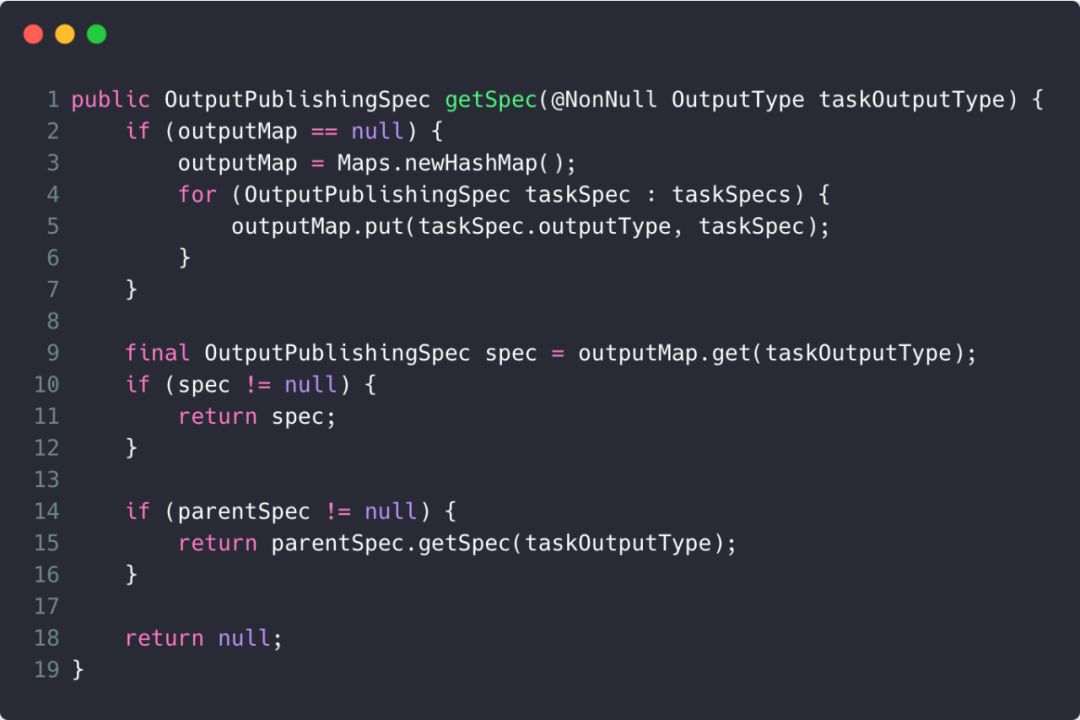 - 遍历taskSpecs,然后将taskSpec的信息放入outputMap中,其中key为taskSpec的outputType,value则为taskSpec自身。之后就是以taskOutputType的值为key,在outputMap中找出相应的value并返回,如果没有找到,则再在parentSpec中找一遍。