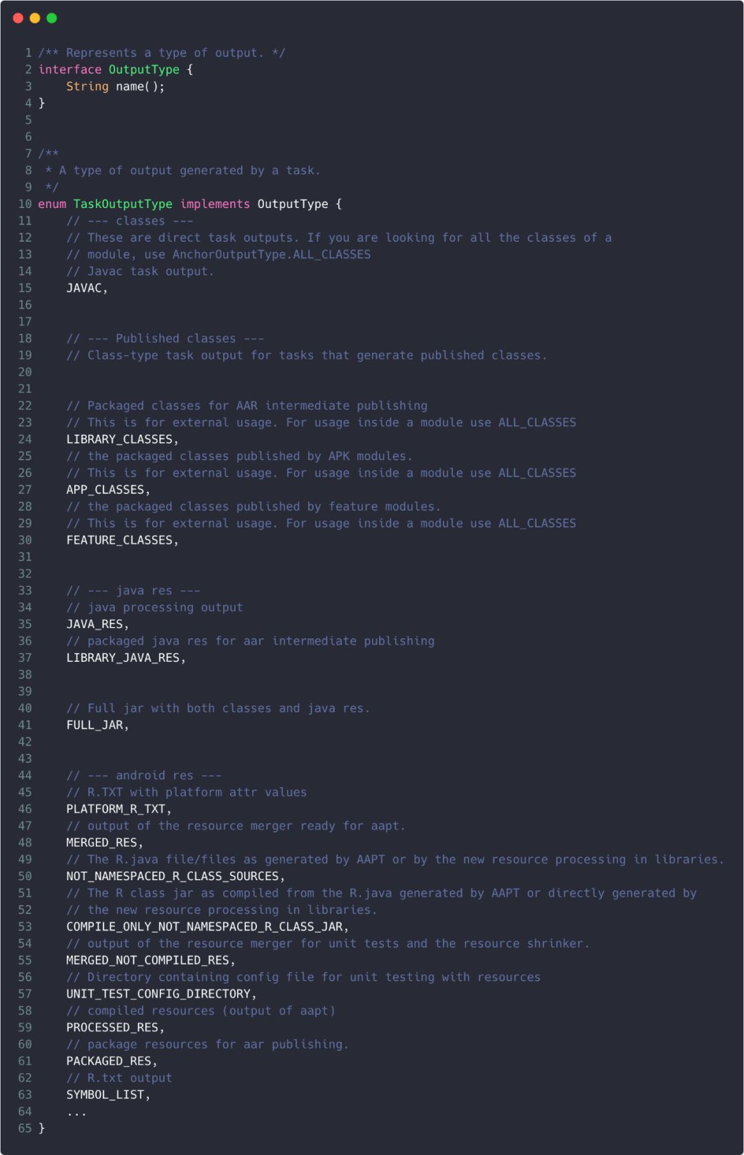显然,OutputType就是表示为输出类型的接口,而TaskOutputType则是task的输出类型,并且为了使用方便,定义成了枚举类。这里选择其中的几个进行讲解。