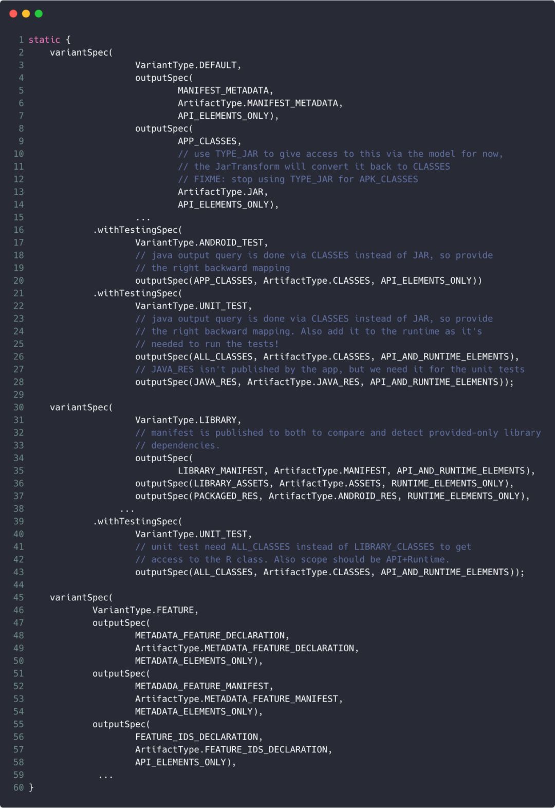 以VariantType.DEFAULT为例,它表示为默认的variant类型,它对应的OutputPublishingSpec对象非常多,有通过outputSpec(MANIFEST_METADATA, ArtifactType.MANIFEST_METADATA, API_ELEMENTS_ONLY)构造的OutputPublishingSpec对象,它表示输出类型为MANIFES_METADATA的task,其对应的产物类型为ArtifactType.MANIFEST_METADATA,可输出到的configuration类型为API_ELEMENTS_ONLY;类似的,可作出如下总结,详细情况请看下一小节。