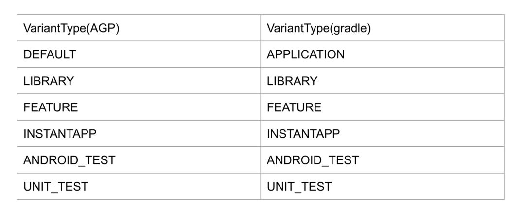 显然,AGP层的VariantType和gradle层的VariantType对应关系如下: