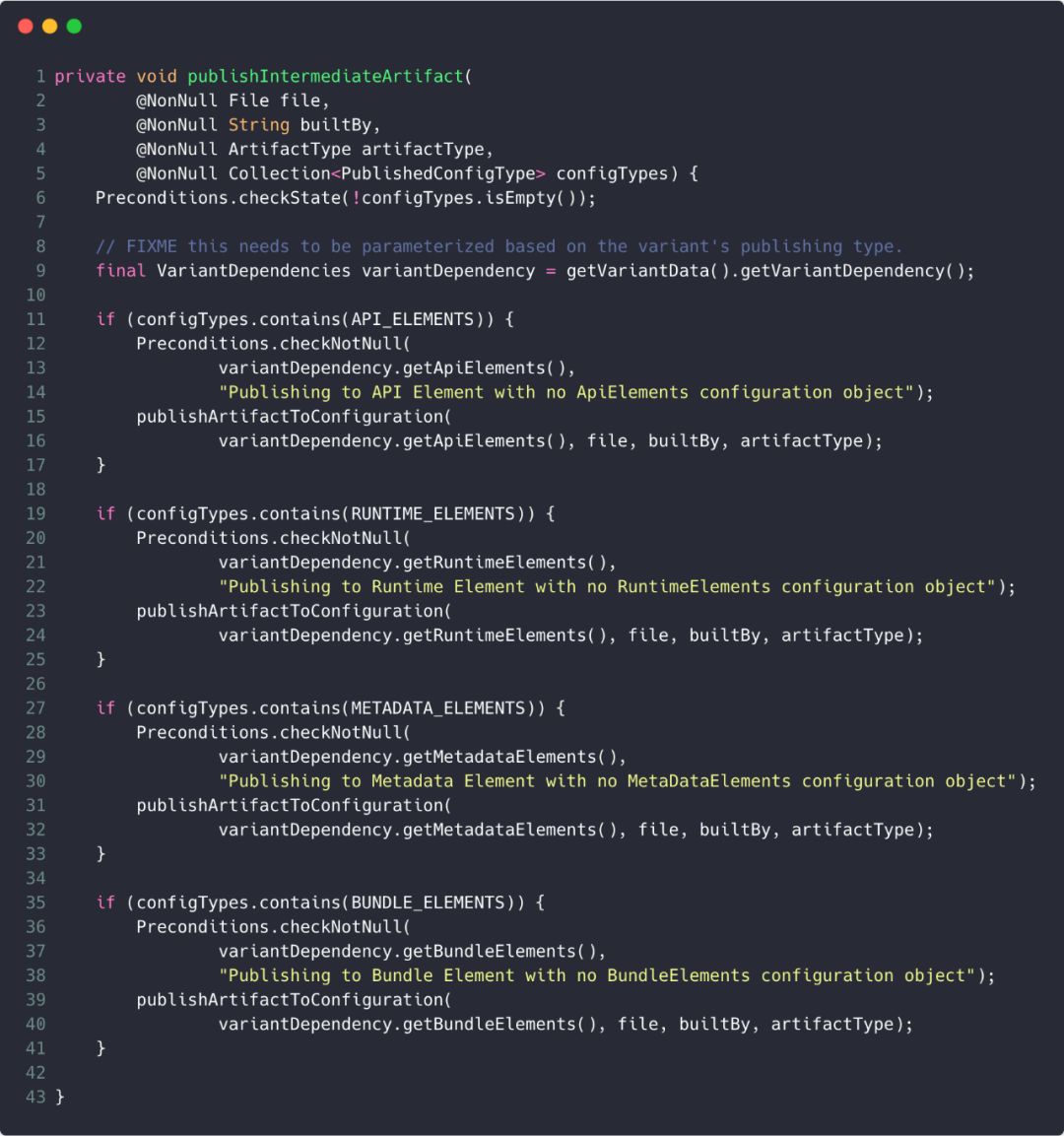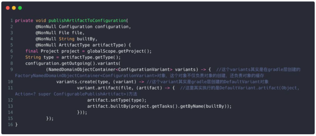 可以看到,这个方法中对于所有的configuration类型都作了处理,上一章说过,由于LIBRARY_MANIFEST对应的publishConfigTypes为API_AND_RUNTIME_ELEMENTS,即同时包含了API_ELEMENTS和RUNTIME_ELEMENTS,之后调用publishArtifactToConfiguration()方法发布到相应的configurion。就以RUNTIME_ELEMENTS为例,则发布到buildVaraintRuntimeElements这个configuration中,比如build variant为debug时,则为debugRuntimeElements。下面分析publishArtifactToConfiguration()方法,如下: