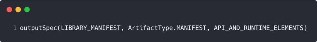 可见,outputType为LIBRARY_MANIFEST,对应的产物类型为ArtifactType.MANIFEST;即此时返回的OutputPublishingSpec对象中outputType为LIBRARY_MANIFEST,产物类型为ArtifactType.MANIFEST,可输出的configuration类型为API_AND_RUNTIME_ELEMENTS。即taskSpec.getArtifactType()为ArtifactType.MANIFEST,taskSpec.getPublishedConfigTypes()为只包含API_AND_RUNTIME_ELEMENTS的Set。之后,调用publishIntermediateArtifact()方法,在下一章分析这个方法的调用流程。