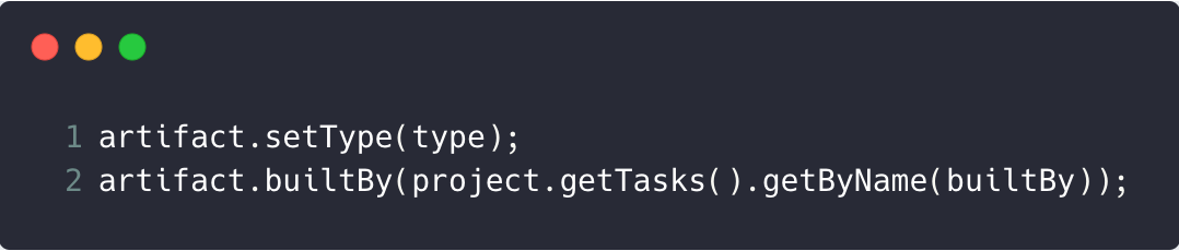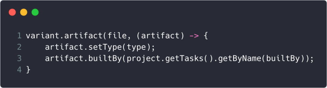 - 在gradle层会创建一个ConfigurablePublishArtifact对象(这个对象缓存在DefaultVariant中),并且会为其设置type和builtBy属性,其中的builtBy就是要生成这个产物所依赖的task。