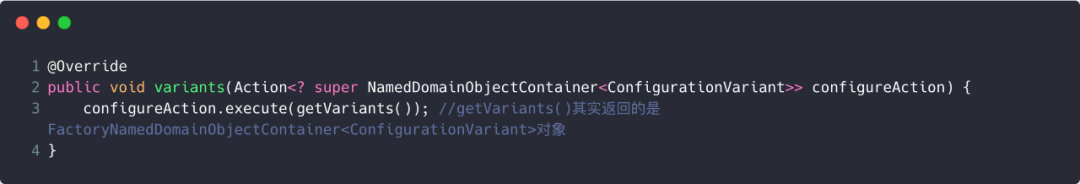 再回到android gradle plugin层,下一步调用outgoing的variants()方法,DefaultConfigurationPublications的variants()方法如下: