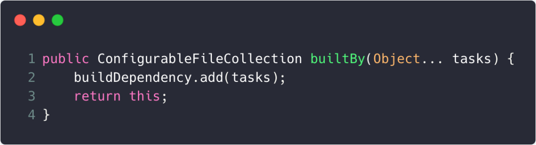 即如果taskName不为空,则为DefaultConfigurableFileCollection对象collection设置编译依赖。而DefaultConfigurableFileCollection的builtBy()方法如下: