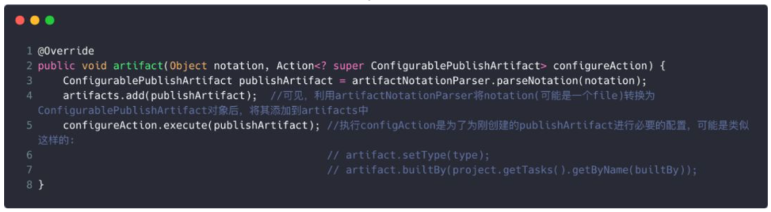 可见,这里先是利用artifactNotationParser创建一个ConfigurablePublishArtifact对象,然后添加到缓存中。之后执行配置操作。
