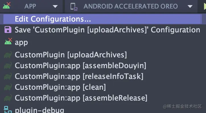 gradle > Configure project :appname: douyinDebug, baseName: douyin-debugname: douyinRelease, baseName: douyin-releasename: weixinDebug, baseName: weixin-debugname: weixinRelease, baseName: weixin-releasename: googleDebug, baseName: google-debugname: googleRelease, baseName: google-release可以看到,name 与 baseName 的区别:baiduDebug 与 baidu-debug 。2)、使用 applicationVariants.all 在配置阶段之后去修改输出的 APK 名称