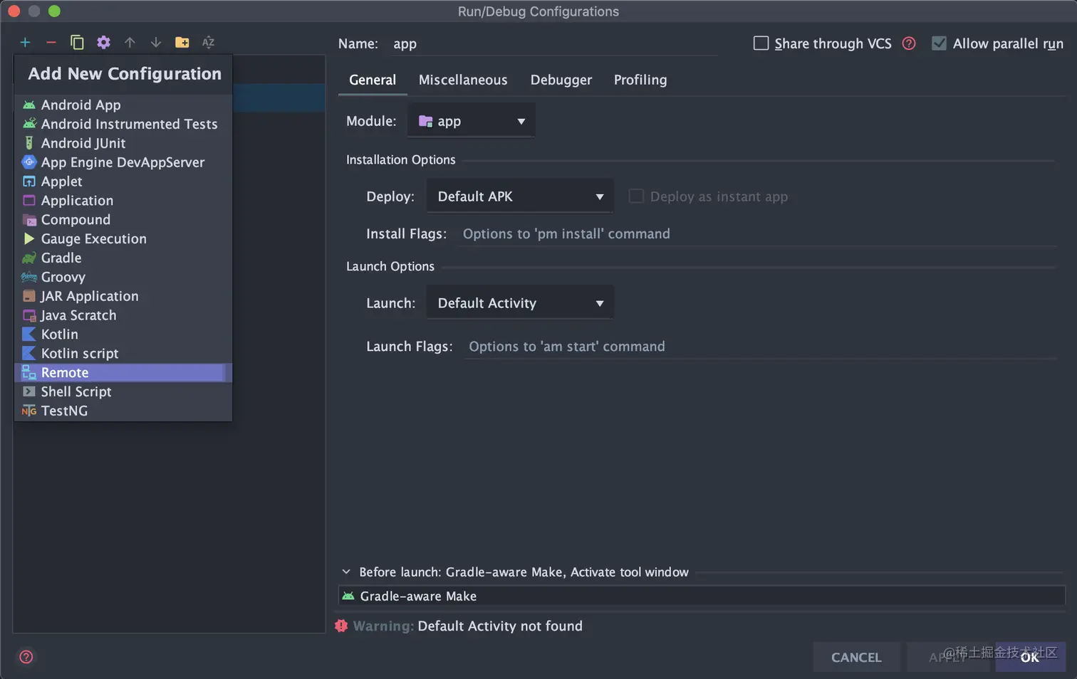 1、首先,我们需要在 AndroidStudio 中增加一个 Remote 配置,如下图所示: