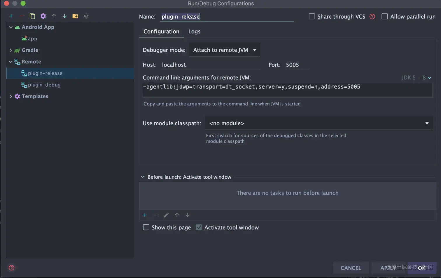 gradle ./gradlew --no-daemon -Dorg.gradle.debug=true :app:assembleRelease3、最后,我们在插件代码中打好相应的断点,选中我们上一步创建的 Remote 配置,点击 Debug 按钮即可开始调试我们的自定义插件代码了。