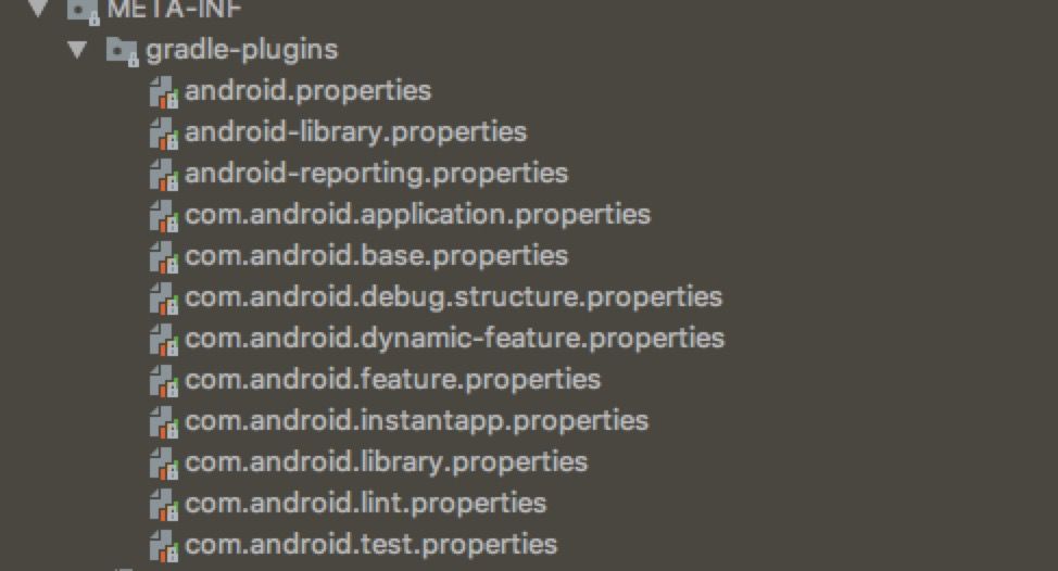 比如我们常用的apply plugin: ‘com.android.application’, 其实是对应的AppPlugin, 其声明在源码的META-INF中,如下图所示: