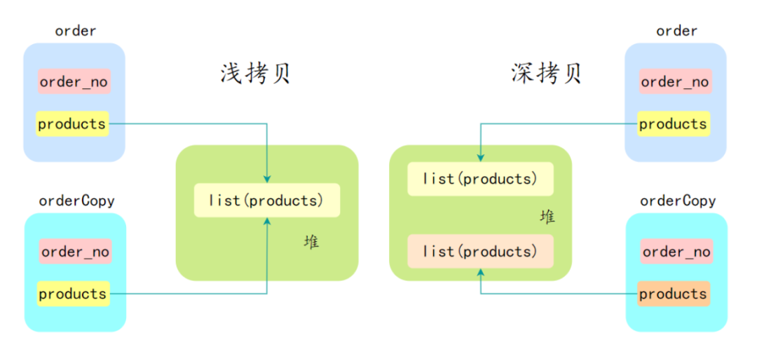 例如现在有一个 order 对象,里面有一个 products 列表,它的浅拷贝和深拷贝的示意图:
