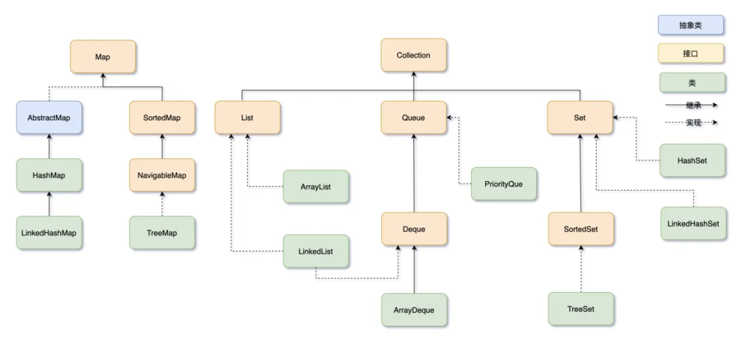 - Queue:一个用于保持元素队列的集合。实现类包括 PriorityQueue、ArrayDeque 等。