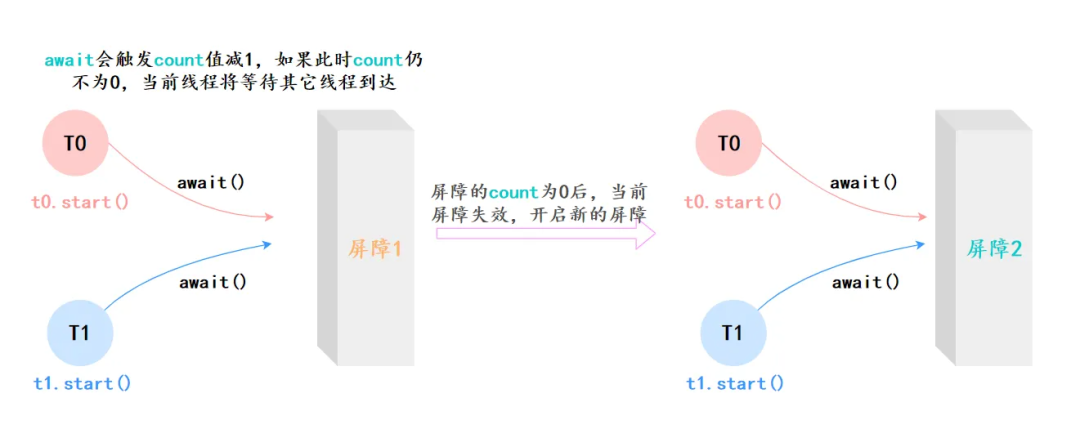 - 如果当前线程不是第一个到达屏障的话,它将会进入等待,直到其他线程都到达,除非发生被中断、屏障被拆除、屏障被重设等情况;