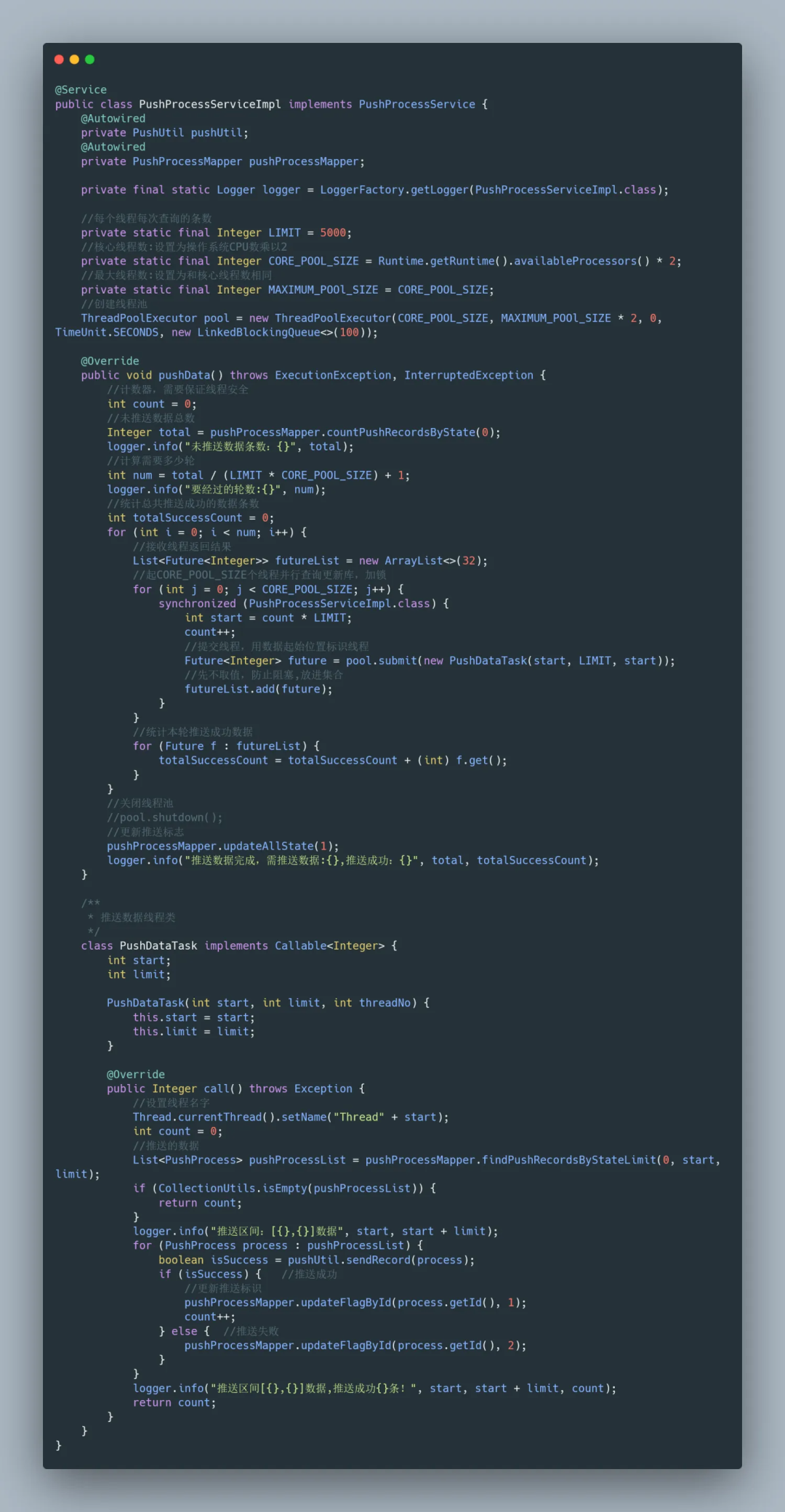 synchronized (PushProcessServiceImpl.class) {}ps:这个例子只是简单地进行了数据推送,实际上还可以结合其他的业务,像什么数据清洗啊、数据统计啊,都可以套用。