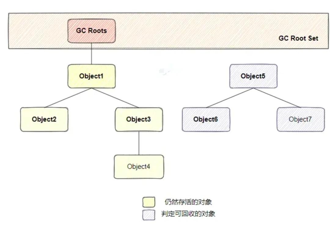 目前 Java 虚拟机的主流垃圾回收器采取的是可达性分析算法。这个算法的实质在于将一系列 GC Roots 作为初始的存活对象合集(Gc Root Set),然后从该合集出发,探索所有能够被该集合引用到的对象,并将其加入到该集合中,这个过程我们也称之为标记(mark)。最终,未被探索到的对象便是死亡的,是可以回收的。