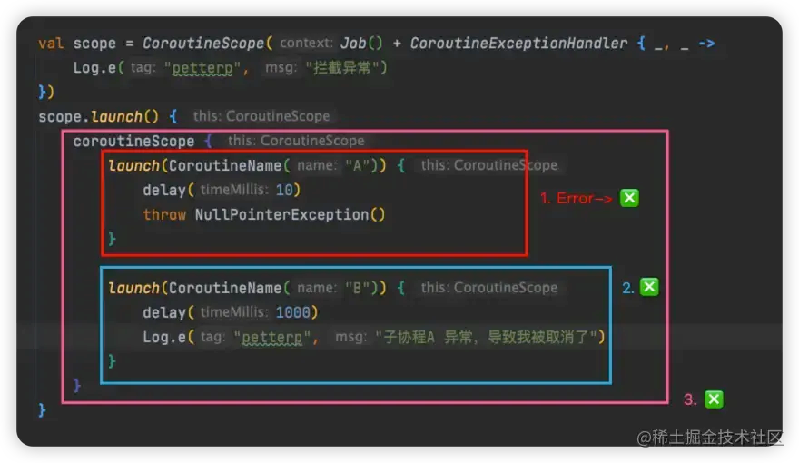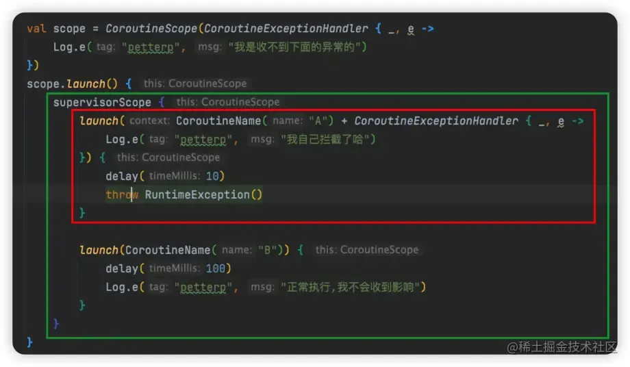 val scope = CoroutineScope(Job())scope.launch(CoroutineExceptionHandler { _, _ -> }) { supervisorScope { launch(CoroutineName("A")) { throw NullPointerException() } launch(CoroutineName("B")) { delay(1000) Log.e("petterp", "依然会正常执行") } }}