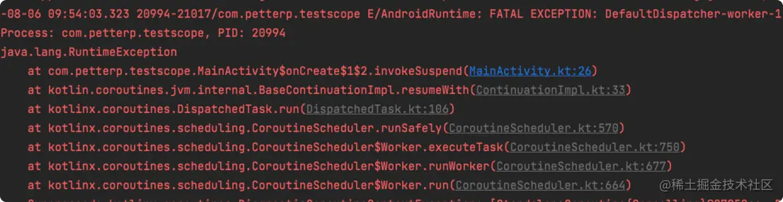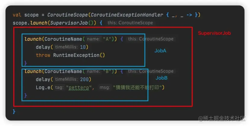 val scope = CoroutineScope(CoroutineExceptionHandler { _, _ -> })scope.launch(SupervisorJob()) { launch(CoroutineName("A")) { delay(10) throw RuntimeException() } launch(CoroutineName("B")) { delay(100) Log.e("petterp", "正常执行,我不会收到影响") }}猜一猜B协程内部的log能否正常打印?