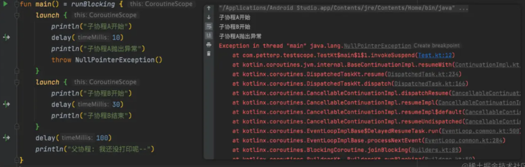 在上图中,我们创建了 两个子协程A,B,并在 A中 抛出异常,查看结果如右图所示, 当子协程A异常被终止时,我们的子协程B与父协程都受到影响被终止。